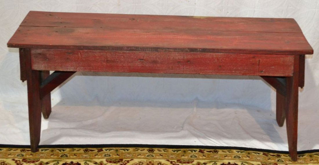 SoldAMERICAN COUNTRY PAINTED SAWBUCK WORK TABLE.Mid 19th century, pine. Old red wash, bin top, two left side drawers, top has stencil "59 and Co. Portland Me", "X" legs with stretchers. Could also be used as a sorting table or primitive dry sink. ASee Sold Price