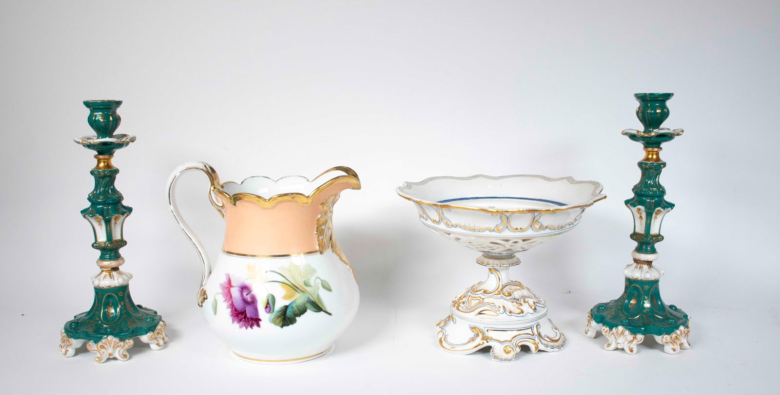 Old Paris Porcelain Pitcher, Compote, Candlesticks