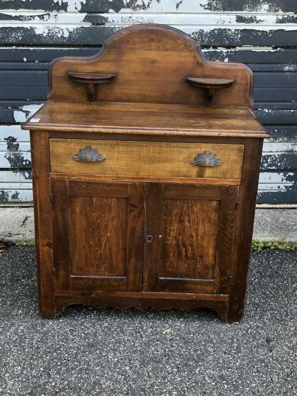 OLD WASHSTAND W/BACKSPLASH, CARVED PULLS, MEASURES