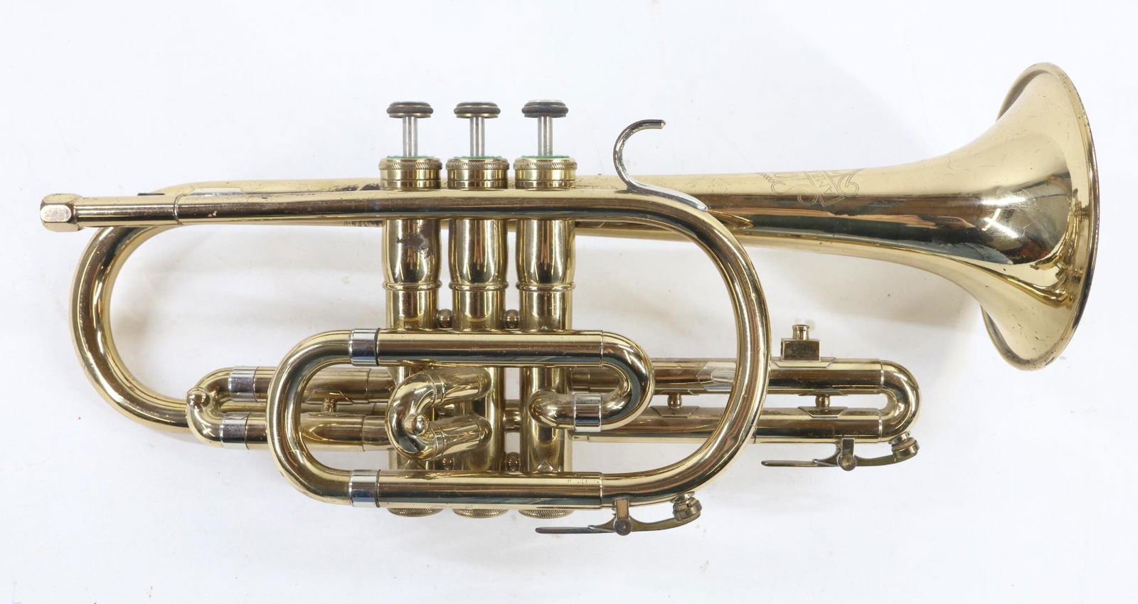 SoldOlds Ambassador CornetOlds Ambassador cornet trumpet, serial #43969, Olds #3 mouthpiece, c 1948, with hard case, missing one bottom valve cap, surface scratching & pittingSee Sold Price
