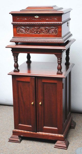 SoldDELUXE 'THE OLYMPIA' 20" DISC MUSIC BOX ON ORIGINAL STAND1899 'The Olympia' Music Box in ornately carved cherry case, on the original matching cabinet base which contains (26) 20 1/2" discs, The interior of the lid retains the original litho winter landscapSee Sold Price