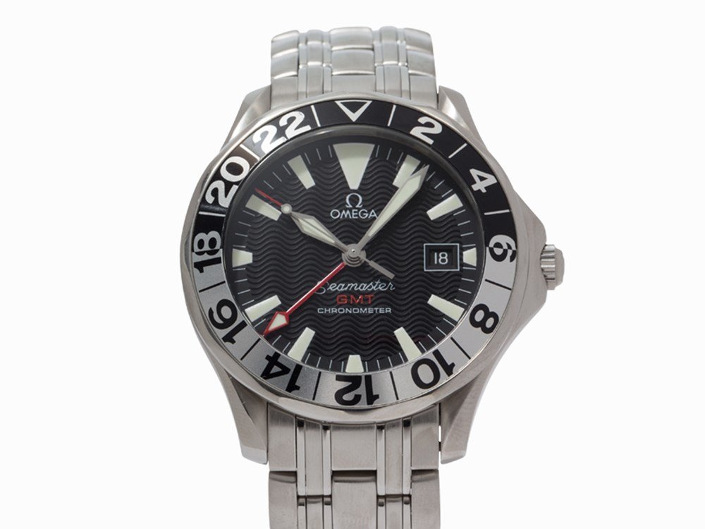 Omega Seamaster GMTOmega Seamaster Professionsl GMT. Stainless steel case and blue rotating bezel. Navy blue wave pattern dial with luminous hands and numeral markers. Automatic movement. Case zise; 41 mm. Stainless steSee Sold Price