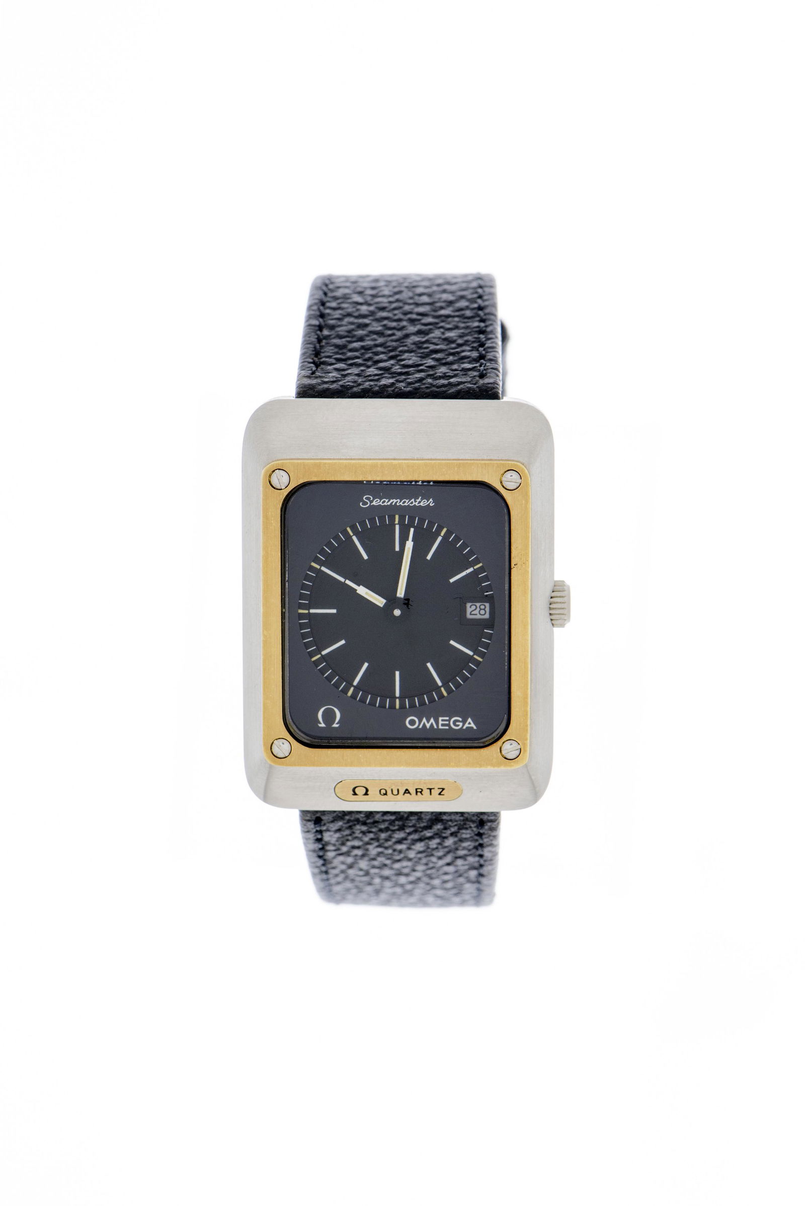SoldVINTAGE OMEGA SEAMASTER QUARTZ AND DE VILLE WRISTWATCHSTwo vintage Omega watches. The Omega Seamaster Quartz wristwatch boasts a cushion-shaped dial featuring baton hour markers, a day-date aperture at 3 oclock, an outer minutes track, and a signed quartzSee Sold Price