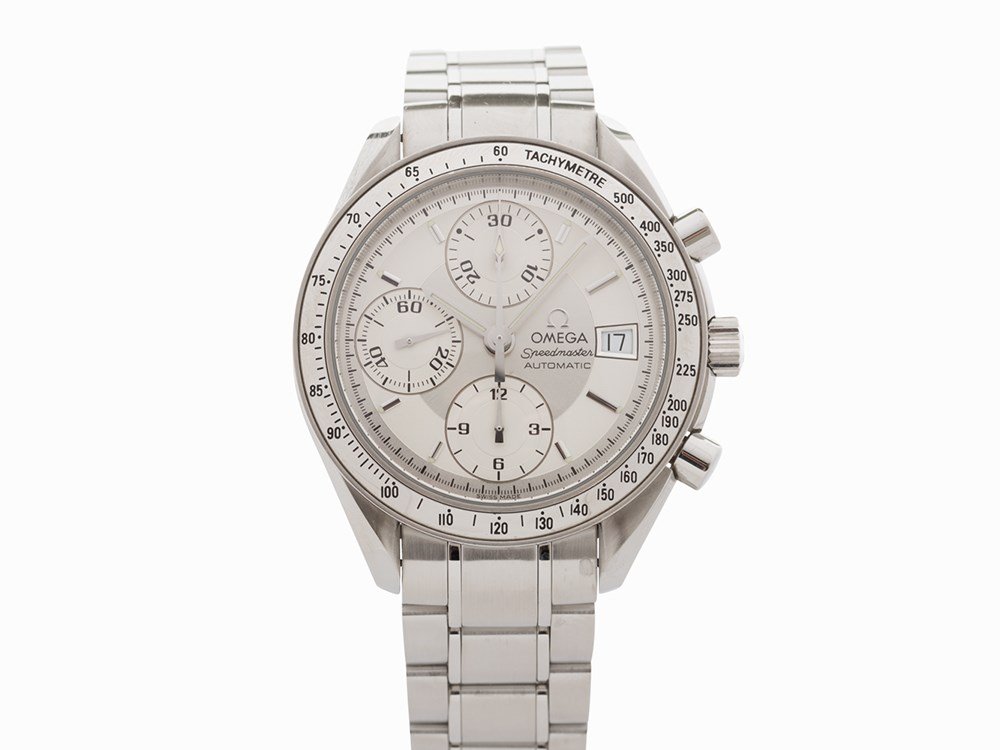 SoldOmega Speedmaster Automatic Day Date Chrono Ref 3521.80 38mmOmega stainless steel Speedmaster Automatic Day Date Chrono with white dial Ref 3521.80 38mm. Good working order. Comes with deteriorated original box. See Sold Price