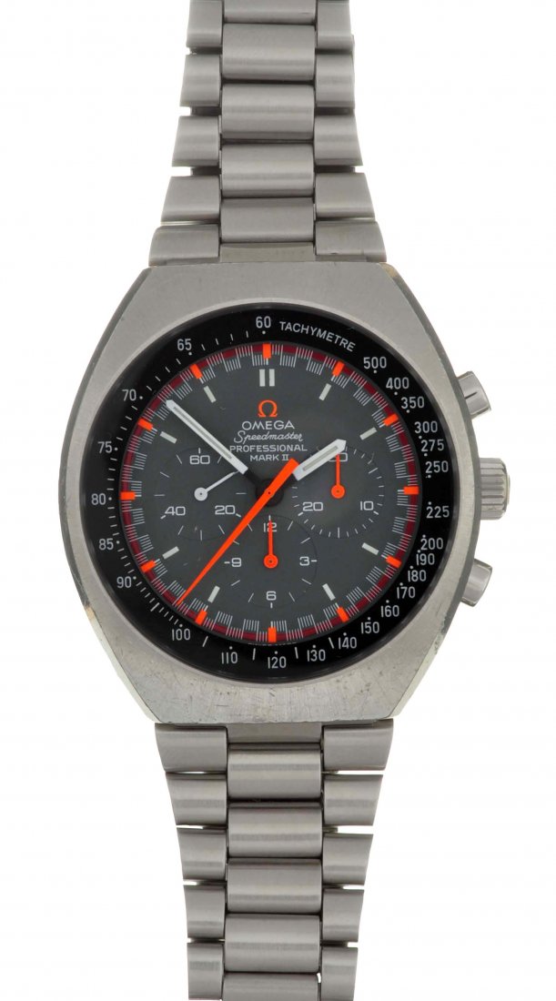SoldOmega Speedmaster Professional Mark II ChronographMETAL: stainless steel. MEASUREMENTS: case is 40mm excl. crown x 45mm lug tip to lug tip. Original Omega steel bracelet will fit up to 7.5" wrist and is 24mm at widest point. Grey dial with orangSee Sold Price