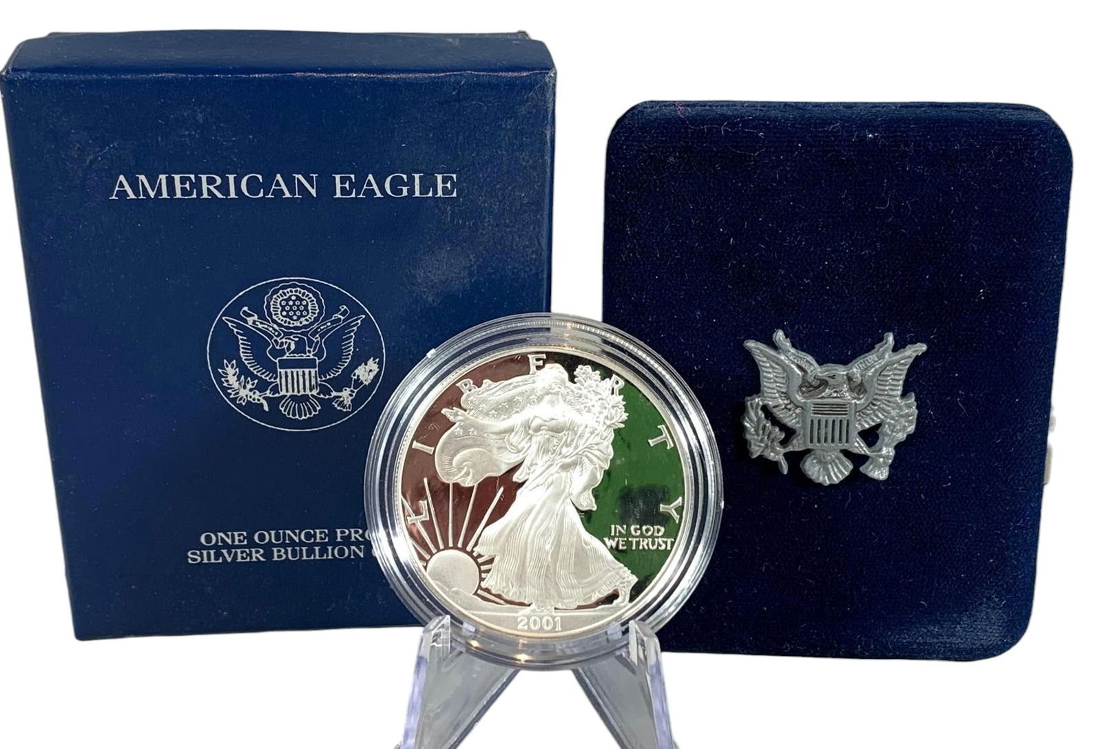 Sold2021 US SILVER EAGLE PROOF W/ COA2021 US American Eagle one oz silver proof coin. Accompanied by a presentation box, outer sleeve, and COA. coin dia. 40.6mm. Approx total coin weight 1 ozt. Box h. 3.25", w. 3.375", d. 1.25". Ahlers &See Sold Price