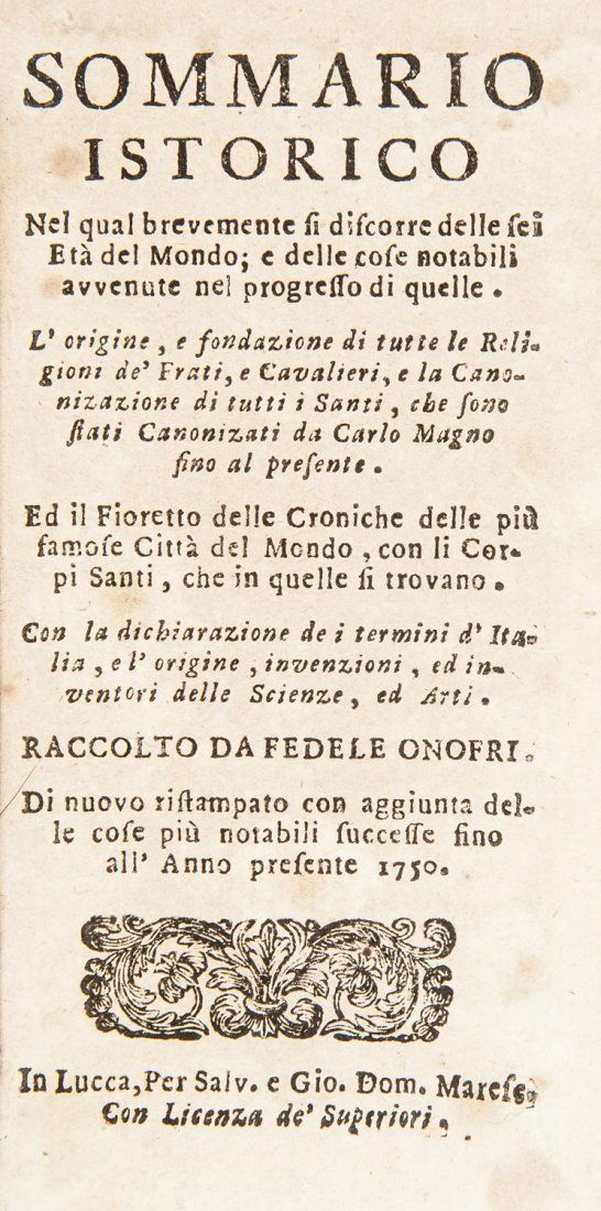 Levant.- Sansovino (Francesco) Gl'Annali turcheschi overo vite de principi della casa othomana,Feb 26, 2026China.- Le Gobien (Charles) Istoria dell'editto dell'Imperatore della Cina, in favore dellaFeb 26, 2026PAOLO GIOVIO'S 1608 MEDIEVAL HISTORY ANTIQUE 17 CENTS VARIA'S SELVA ISTORIAMar 01, 2026Europe.- Riccio (Michele) De Regibus Hispaniae, Hierusalem, Galliæ, Utriusqie Sicilliæ & Ungariæ,Feb 26, 20261607 IL VAGO & DILETTEUOLE GIARDINO OVE SI LEGGONO antique ITALIAN1561 Paolo GIOVIO LIVES of NINETEEN ILLISTRIOUS MEN antique 16th CENTURY1598 DELLE ORATIONI LATINE et VOLGARI by Vittorio Carcano antique 16th CENTURY1566 Baths & other wonders of Puteoli by Lombardi antique1592 DEL REGNO DI PORTOGALLO ALL CORONA di CASTIGLIA antique HISTORY of PORTUGAL1607 COMPARATIONE DI HOMERO VIRGILIO e TORQUATO by PAOLO BENI antique1580 CHRONOLOGY OF THE WORLD by F. SANSOVINO antique VELLUM BOUND1588 ASTRONOMY & ASTROLOGY Almanac o Vero Efemeridi de Pianeti antique RARE1644 TRAVAGLI DI GIESU by Fr. Tomaso di Gesu antique Travails of Jesus VELLUMOROSIO. Paulo Orosio tradotto di latino in volgare.5 hrs LeftPAOLO MORIGIA, "HISTORY OF RELIGIONS," 1586, 16TH CENTURYMar 01, 2026Emblems. CAPACCIO. Delle imprese trattato di Giulio Cesare Capaccio.5 hrs Left