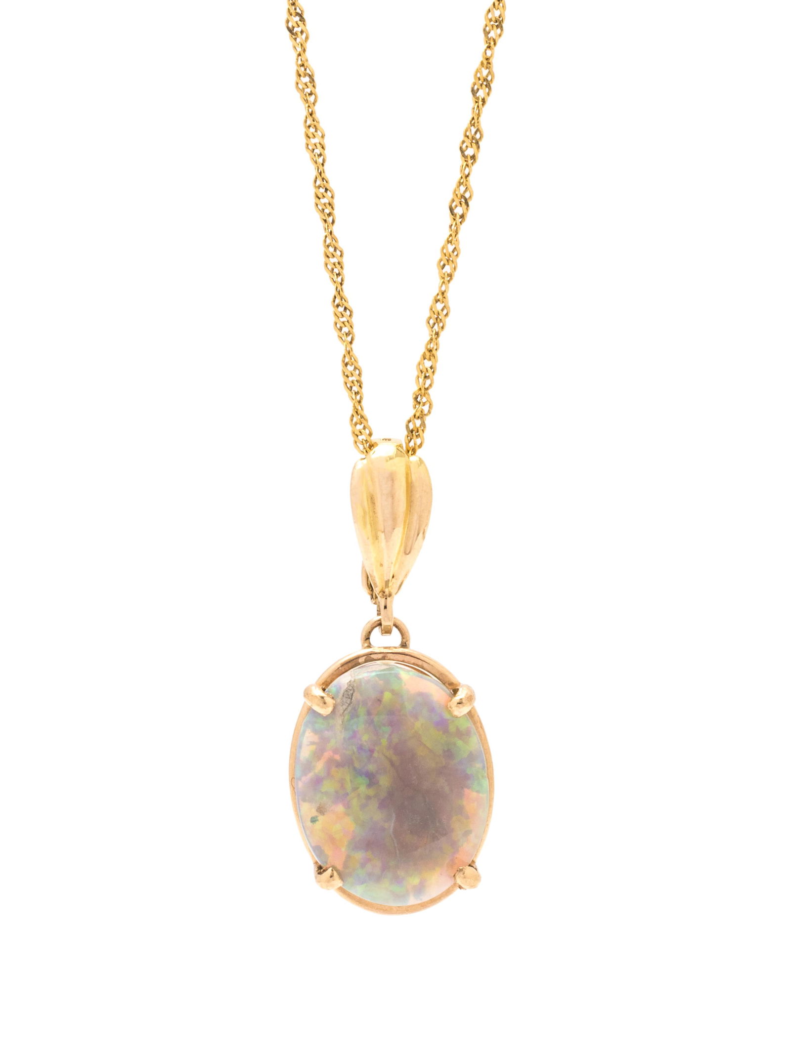 SoldAn Opal Pendant Necklace.An Opal Pendant Necklace. 14 karat yellow gold pendant mounting contains one bezel set crystal black opal which weighs approximately 1.04 carats. Together with a 14 karat yellow gold box chain (lengthSee Sold Price
