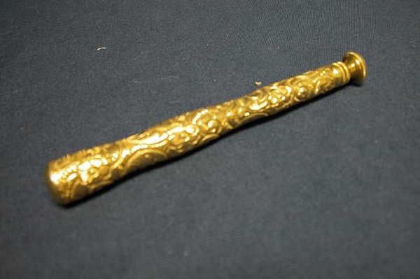 SoldTwo Gold Filled Victorian Items, 19th c., Parasol- H.- 9 1/8 in., Dia.- 1 1/4 in.; Glasses- H.-Two Gold Filled Victorian Items, 19th c., consisting of a parasol handle engraved "May B. Pfister," and a Mother-of-Pearl retractable opera glasses handle, Parasol- H.- 9 1/8 in., Dia.- 1 1/4 in.; GlaSee Sold Price