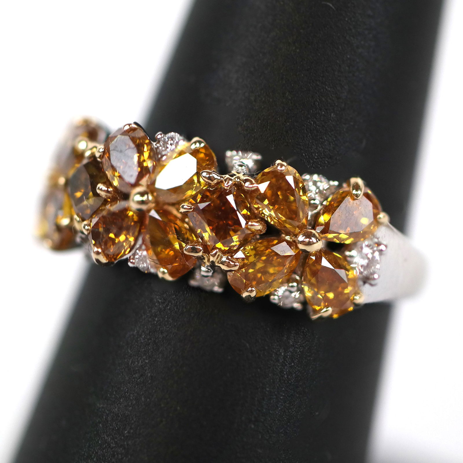 SoldUNIQUE 18K FANCY ORANGE & YELLOW DIAMOND RINGUNIQUE 18K FANCY ORANGE & YELLOW DIAMOND RING: 18K white gold diamond ring features twelve round, oval and pear brilliant cut Fancy Orange and Fancy Yellow diamonds approximately 1.80 Ct, rated VS-I1See Sold Price