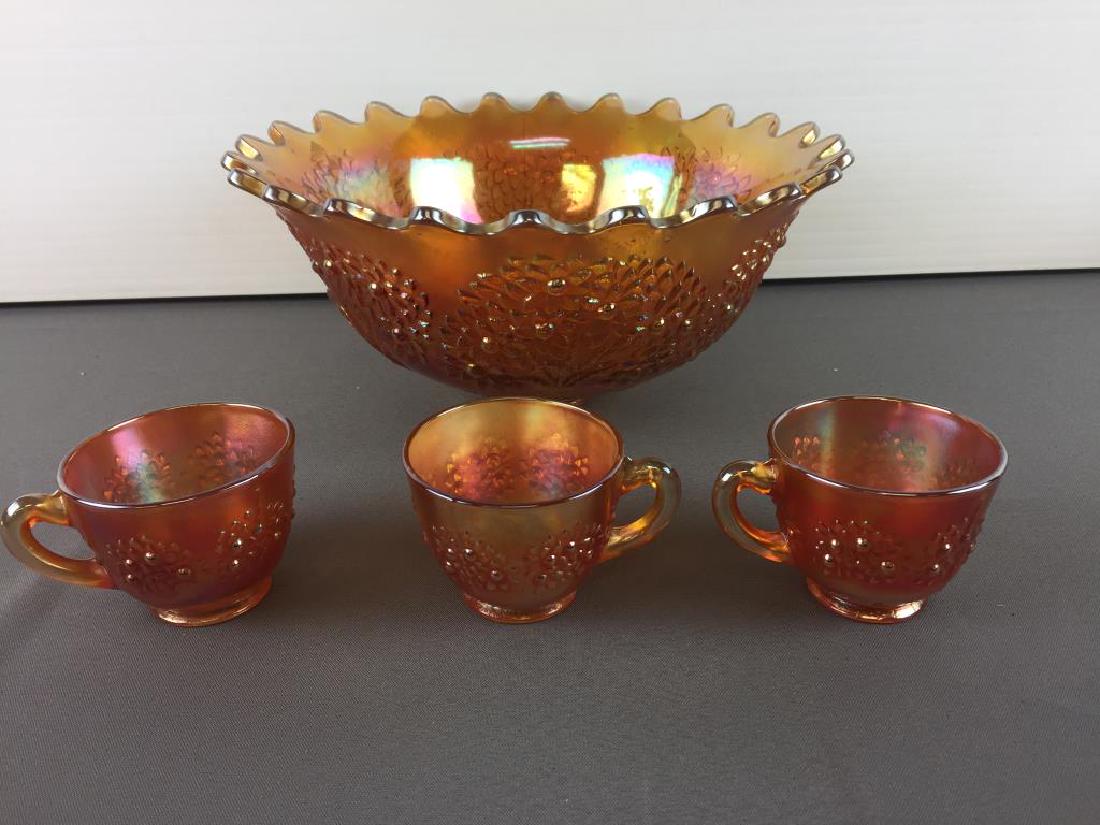SoldPunch Set, Carnival Glass, Orange Tree, MarigoldPunch Set, Carnival Glass, Orange Tree, Marigold, By Fenton, (1) 10.25" X 10.5" Two Part Punch Bowl, (6) Matching Punch Cups, Three Cups With Chips, Dick & Diane Elder Collection.See Sold Price