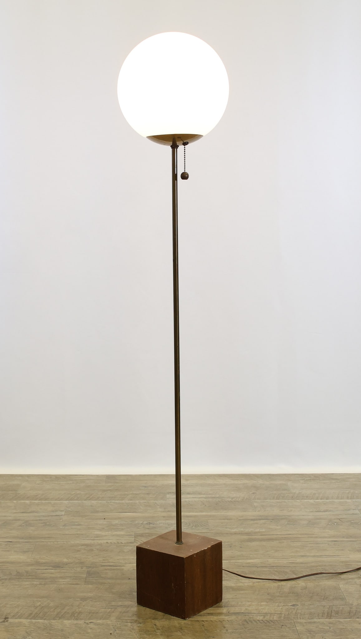 SoldMid-Century Modern Space Age Aluminum Floor LampMid-Century Modern Space Age Aluminum Floor Lamp, with orb-shaped lampshade. 44" H x 12" W x 6.5" D. Provenance: From a New York City Collection. Keywords: Lighting, Fixture, Interior Decor, Globe, StSee Sold Price
