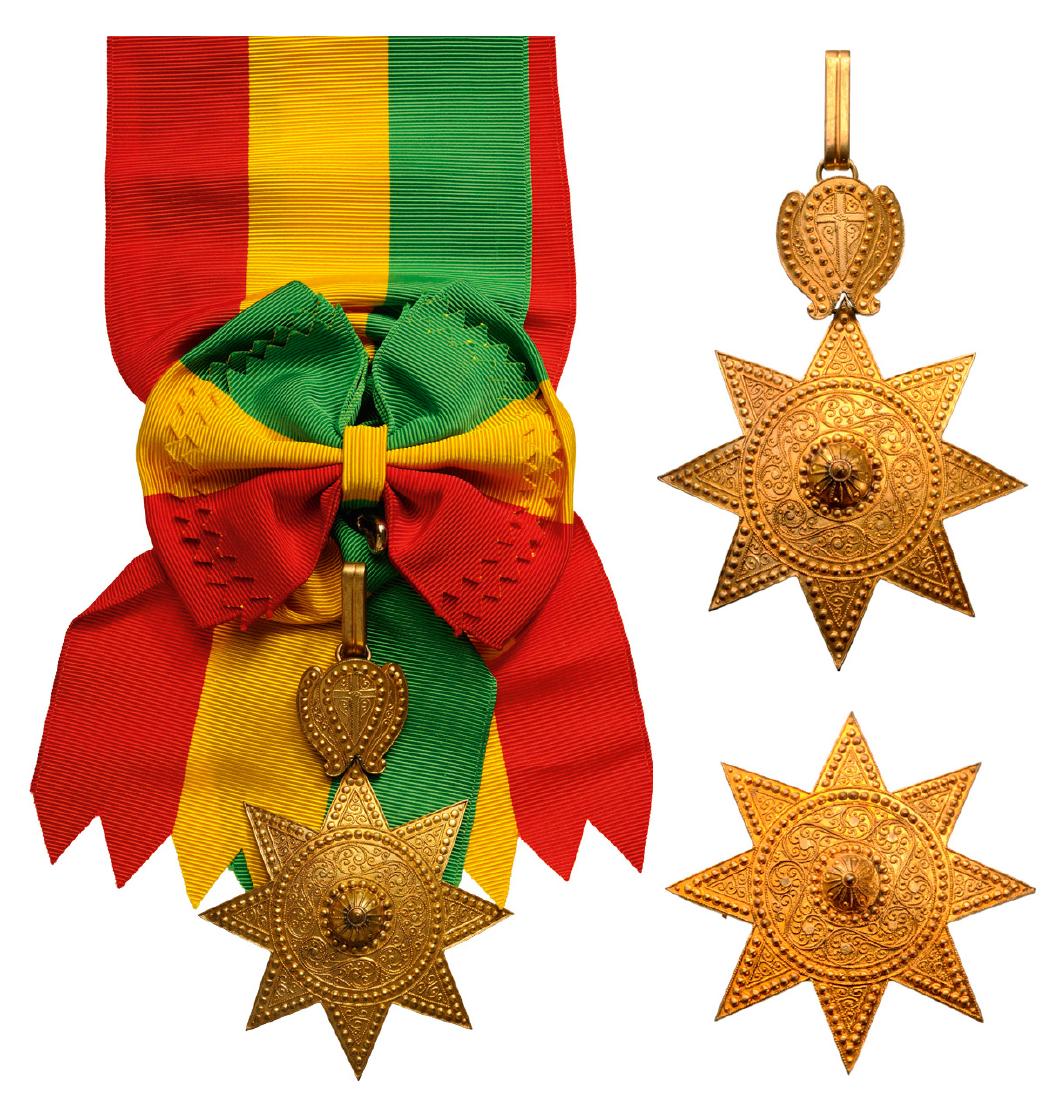 SoldORDER OF THE STAR OF ETHIOPIAGrand Cross Set, 1st Class, instituted in 1884. Sash Badge, 105x80 mm, gilt Bronze with ornamented rays, central medallion gilt bronze, original suspension loop and sash. Breast Star, 80 mm, gilt BronSee Sold Price