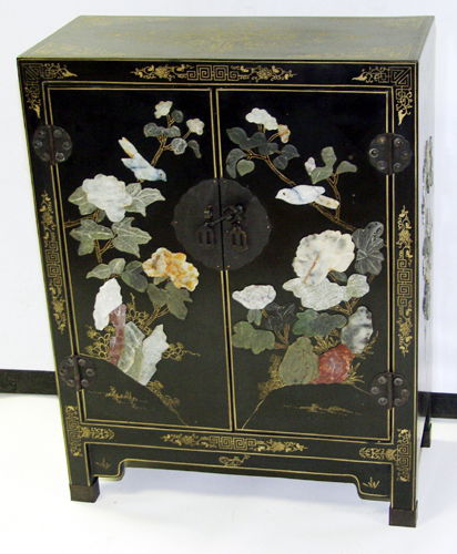SoldAsian Black Lacquer Jewelry Box with Inlaid Mother of PearlCabinet style box with dragon and floral inlaid designs in Mother of Pearl. Front of cabinet has bottom drawer and top is double doors that opens to 3 interior drawers. Interior drawers are painted reSee Sold Price