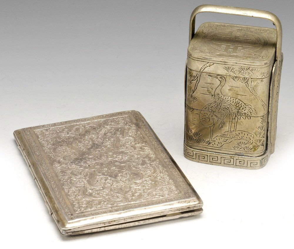 VINTAGE LADIES NECESSAIRES LOT LOCKET BOXES3 days LeftSt Dupont Silver & Goldplated Lighters 2pc LOT13 hrs LeftLot of Antique Japanese 24K Gold Inlaid Cigarette CasesFeb 21, 2026Tin, Silverplate and Metal Novelty Coin Banks 7pc13 hrs LeftGerman Sterling Silver Cigarette Case with a Sapphire StoneA Group of Chased Silver Boxes/Compacts6 days LeftColibri of London Silver-Tone Cigarette Case and Engraved Compact Mirror16 hrs LeftA FRENCH ENAMELED GOLD CIGARETTE CASE AND MATCHING LIGHTER MARK OF OSTERTAG, PARIS, CIRCA 1935Feb 19, 2026Chinese Silver Mirrored Makeup Compact Box Republic PeriodFeb 14, 2026Silverplated Basket & Ink StandFeb 16, 2026A Gorgeous Gilt-Silver 'Buddha Shakyamuni' Box With A Scroll Of Buddhist SutrasMar 06, 2026Art Deco Nickel Silver Dual Compartment Makeup Compact With MirrorFeb 15, 2026AN AMERICAN JADE-MOUNTED SILVER CIGAR BOX AND SIMILAR MATCHBOX HOLDER MARK OF EDWARD I. FARMER, NEWFeb 19, 2026AN AUSTRIAN ENAMELED AND ANTLER-MOUNTED SILVER CIGARETTE CASE AND A SILVER MINAUDIERE THE CIGARETTEFeb 19, 2026Great Ming Chenghua Nian Zhi Covered Jar with Openwork Floral ScrollsFeb 28, 2026Collection of Antique Sterling Silver Objects and AccessoriesFeb 21, 2026
