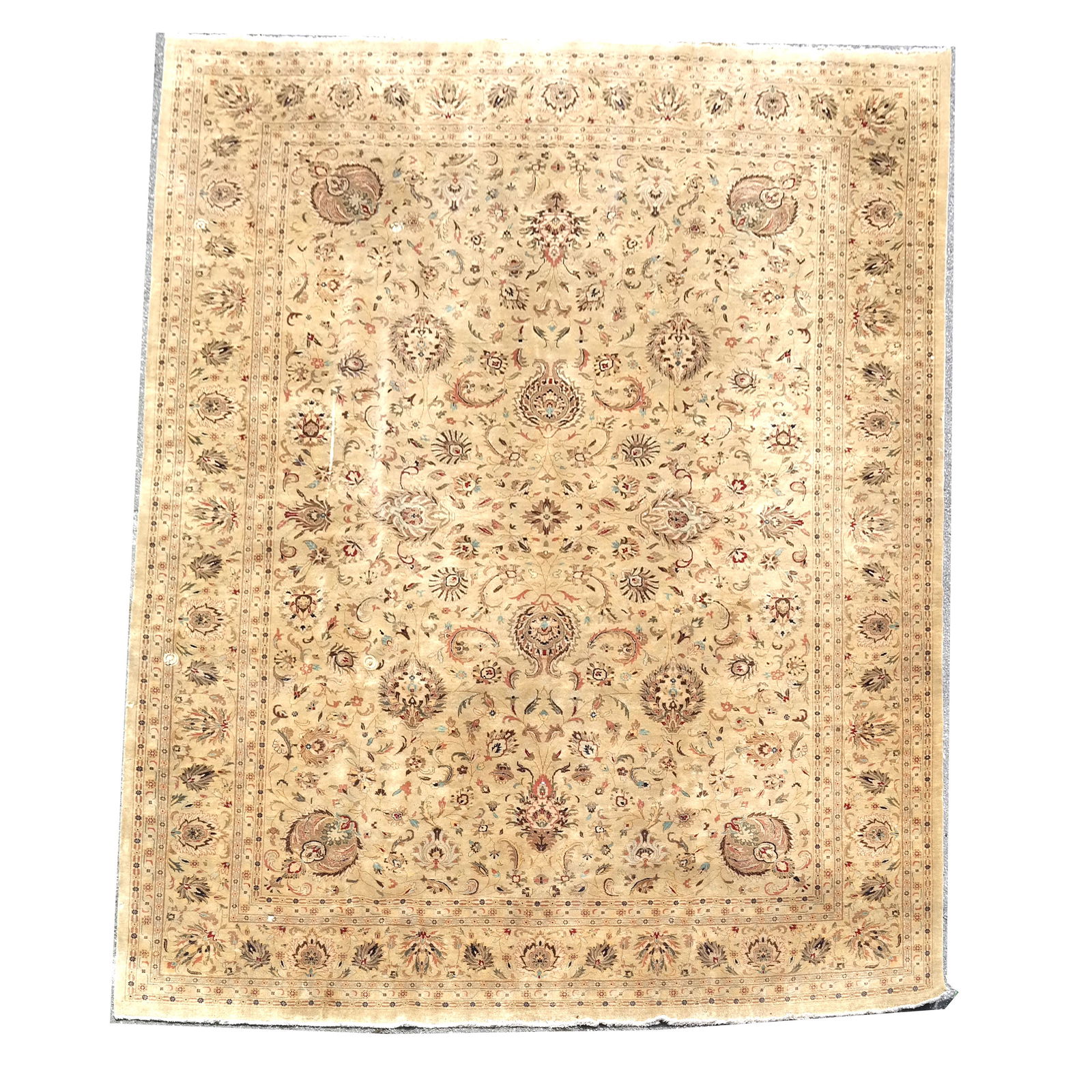 SoldLARGE DECORATIVE ORIENTAL RUGWith floral designs and fringe. A large Oriental rug decorated with numerous patterns of flora and other designs. Orange, cream, red, green and other colors. Hand knotted. Issued: c. 1940 Dimensions:See Sold Price