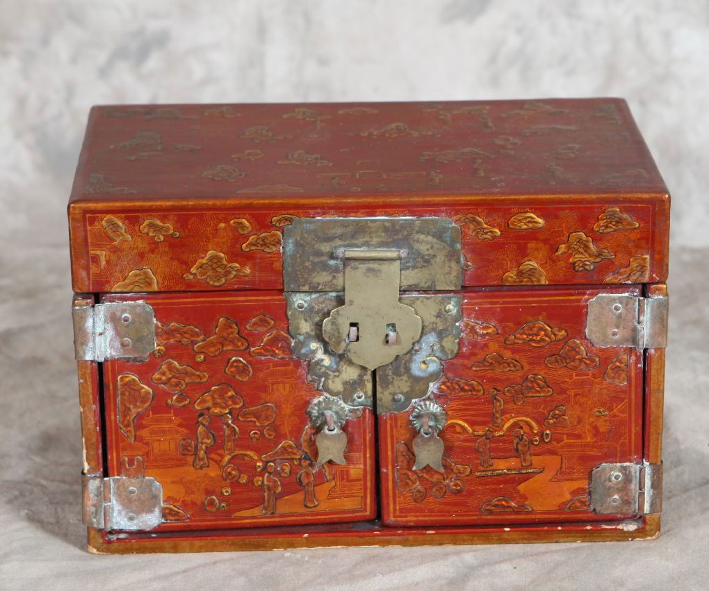 LARGE ANTIQUE CHINESE PAINTED LACQUERED JEWELRY BOX