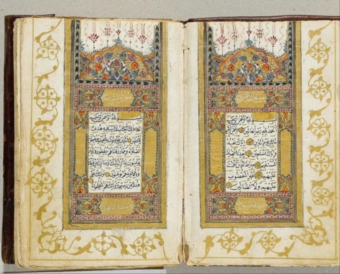 SoldKoranmanuskript 19.Jh., wohl 1839/1840. ArabischeKoranmanuskript 19.Jh., wohl 1839/1840. Arabische Handschrift auf Papier. Kleinformatige Handschrift, Textspiegel eingefasst in schmaler Goldbordüre. Eingangs- und Schlussseiten mit reichem, ornamentSee Sold Price