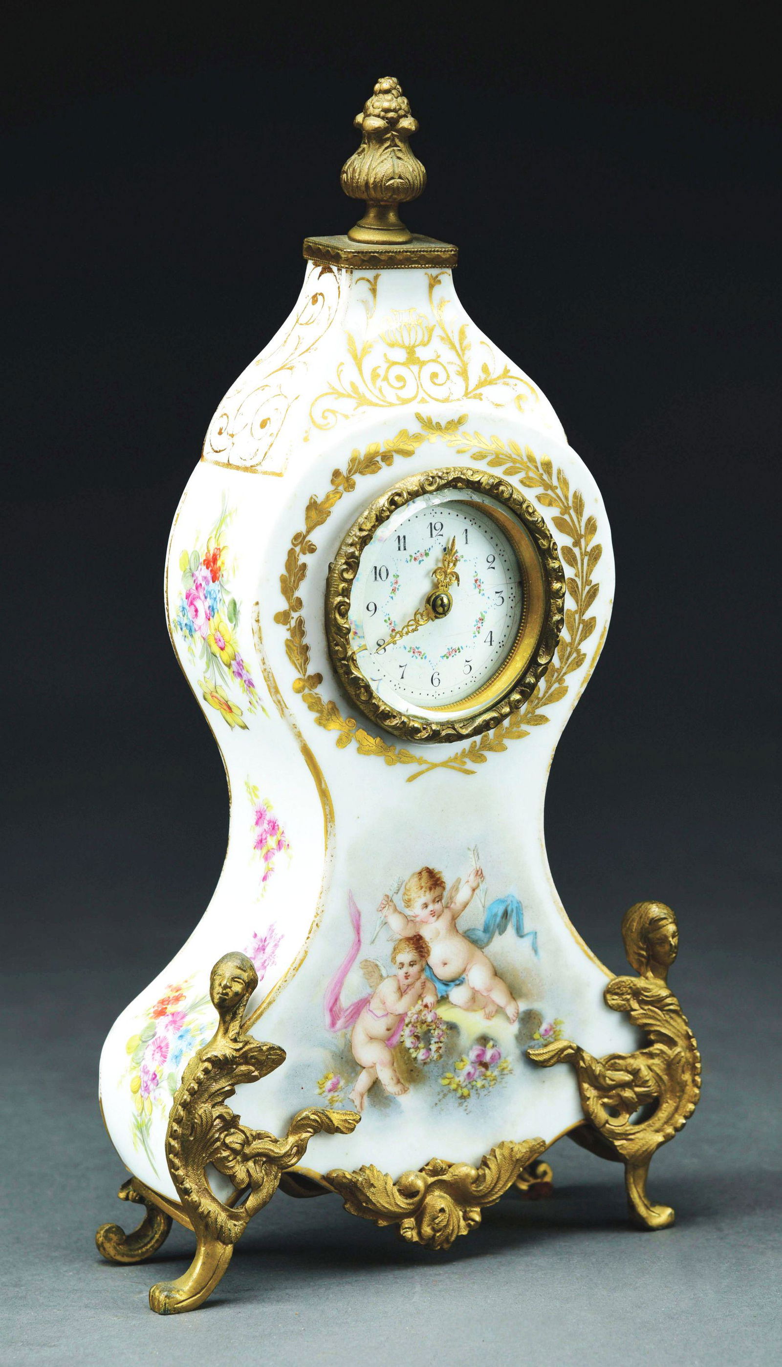 SoldOrmolu Mounted Porcelain Hanging ClockPorcelain hanging wall clock, hand painted leaf and flower decoration, figural ormolu mounts.16"L. Clock not running. Crazing and paint loss throughout, scratches and discoloration to face, face bentSee Sold Price