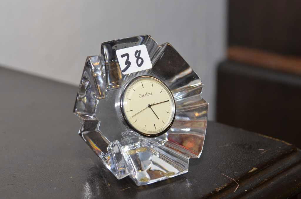 ORREFORS CYSTAL DESK CLOCK, PRESENTATION DATED 1990.