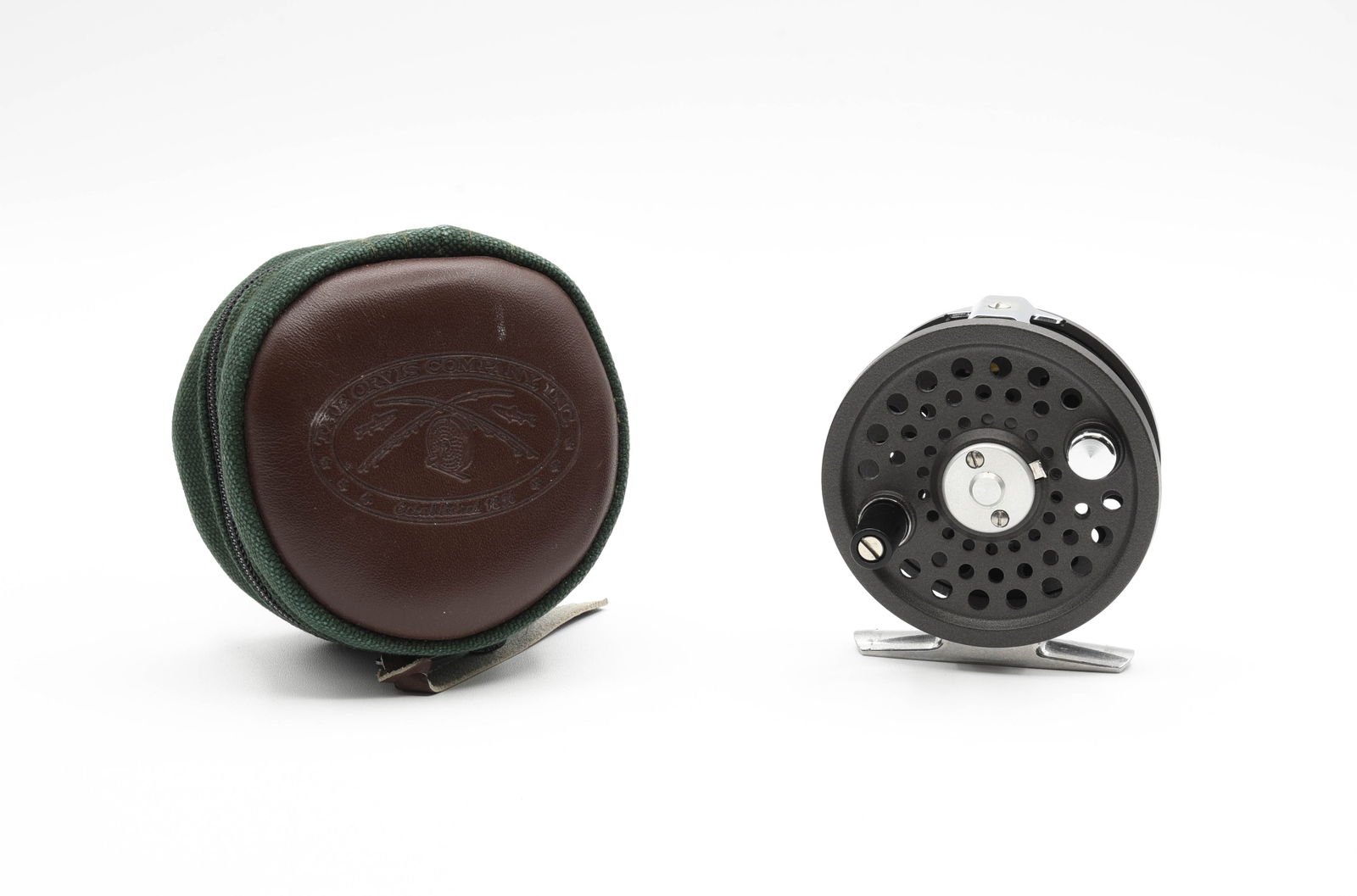 SoldOrvis CFO III Disc Fly Reel3" diameter, 11/16" wide spool, green finish, set for left hand wind, good drag and constant click, unfished Ex/Ex+ condition, in a zippered reel case with Orvis "crossed rods" logo, the correct box aSee Sold Price