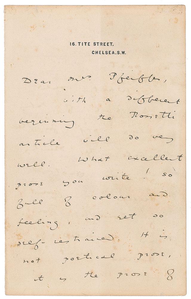 WILDE (OSCAR) Autograph letter signed ('Ever your affectionate/ friend/ Oscar Wilde') to Beatri...14 hrs LeftWILDE (OSCAR) Autograph letter signed to Beatrice Faudel-Phillips, [November 1886]14 hrs LeftWILDE (OSCAR) Autograph letter signed to Herbert Percy Horne, [1891]14 hrs LeftWILDE (OSCAR) Autograph fair copy signed and dated of the poem 'In The Garden'; with gilt tool...14 hrs LeftWILDE (OSCAR) Autograph letter signed to Anne Wakefield Richardson, Tite Street [1887]14 hrs LeftWILDE (OSCAR) Autograph letter signed ('Oscar Wilde') to Henrietta Barnett ('Dear Mrs Barnett')...14 hrs LeftAbraham Lincoln Autograph Letter Signed. One pagFeb 26, 2026Maj. William Ames arrested soldier for drunkennessMar 02, 2026DARWIN. Lettera autografa firmata, inviata a Theodor Gomperz, riguardo “Expression of the15 hrs LeftWILDE (OSCAR) Autograph manuscript titled 'Ballade de Marguerite', [n.d. but 1879-1881]14 hrs LeftWILDE (OSCAR) Autograph manuscript signed of the sonnet 'On hearing the 'Dies Irae' sung in the ...14 hrs LeftHARRIS (FRANK) Autograph letter signed, to Edward Coyle, discussing the publishing of his biogra...14 hrs LeftWILDE (OSCAR) Autograph epigram of four lines, [c.1894]; with facsimile copy of The Chameleon (2)14 hrs LeftReuben T. Wells E Co. NY 115th Infantry, etc. lettersMar 02, 2026Pre-Civil War Pro & Anti-Catholic, Irish content etc.Mar 02, 2026PANKHURST (CHRISTABEL) Autograph letter signed to the Editor of the Daily Mail, 1913, with teleg...