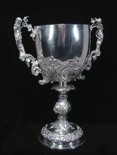 OUTSTANDING LARGE SILVER FIGURAL PRESENTATION CUP WITH
