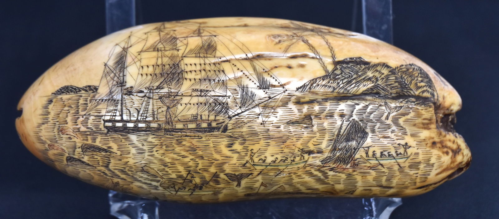 AMERICAN FIGURAL SCRIMSHAW WHALE TOOTH
