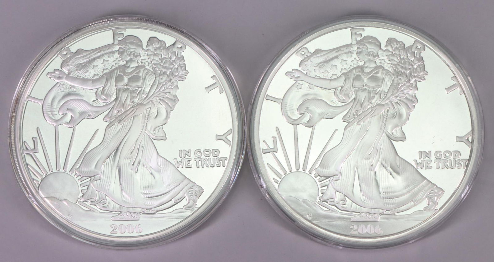 SoldOversized .999 Silver Rounds2000 6 ozt oversize .999 silver round ( 3.5"round), 2001 4 ozt .999 silver oversize quarter, and 2007 12ozt .999 silver oversize silver eagle. 20ozt totalSee Sold Price