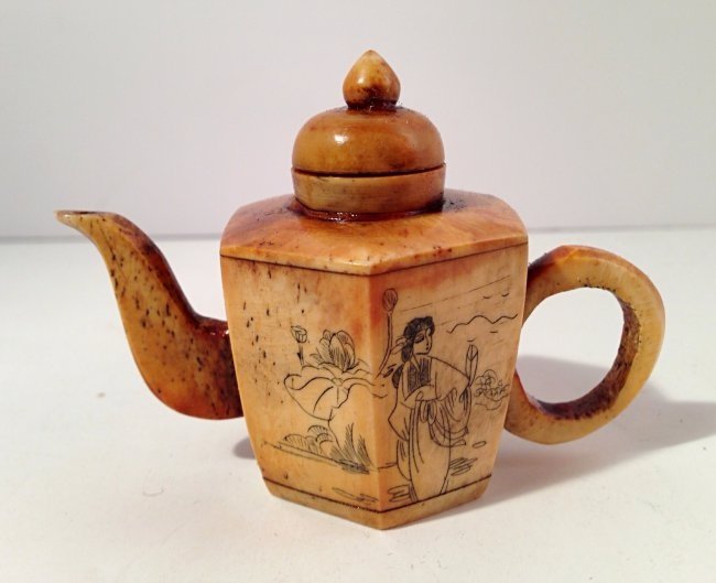 Ox Horn Hand-Carved Plant Teapot w Plum Flower,Old 1015g