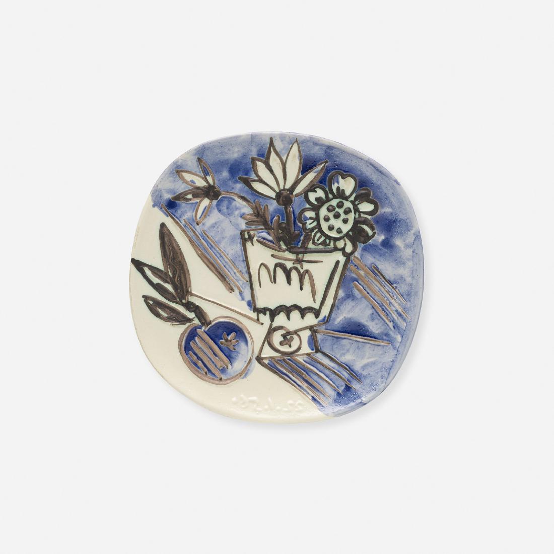 SoldPablo Picasso (1881-1973 Spanish) ''Bouquet a laPablo Picasso (1881-1973 Spanish) ''Bouquet a la Pomme'' (Bouquet with Apple) 1956 Madoura Ceramic Plate 10''x10''. Madoura Plein Feu impressed mark on verso. From the unnumbered edition of 400. ExcelSee Sold Price