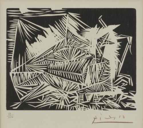 SoldPablo Picasso (Spanish, 1881-1973), Le PigeonneauPablo Picasso (Spanish, 1881-1973), Le Pigeonneaulinocut, 1939, signed in orange crayon and numbered 67/226 lower margin, from the deluxe edition of 40 Dessins de Picasso en Marge Du Buffon, printed bSee Sold Price