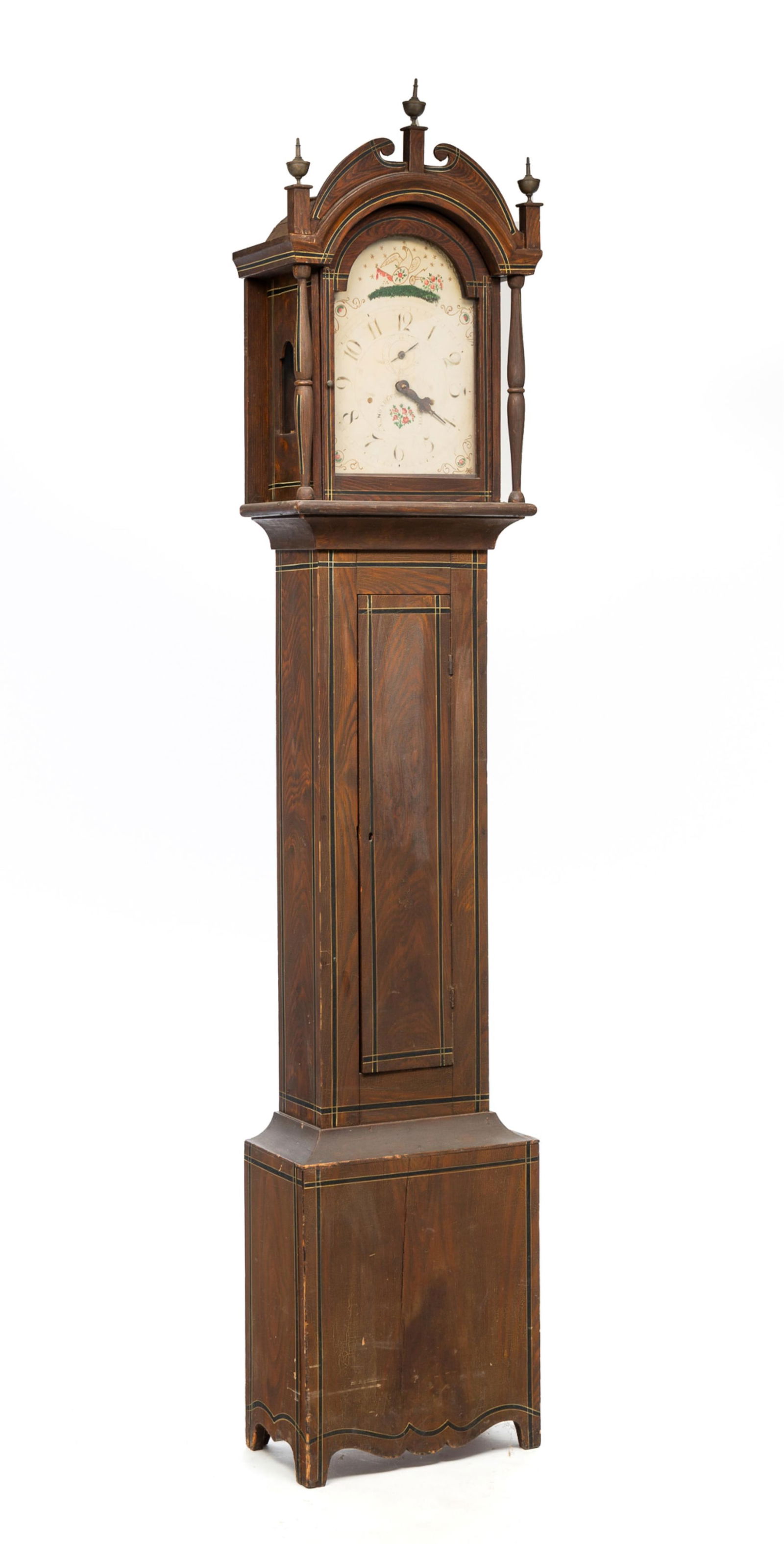 SoldPAINT-DECORATED TALL CASE CLOCK SIGNED HOADLEY.American, early 19th Century. Fine grain-painted case with eagle finial. Signed "S. Hoadley Plymouth". 91"h.See Sold Price
