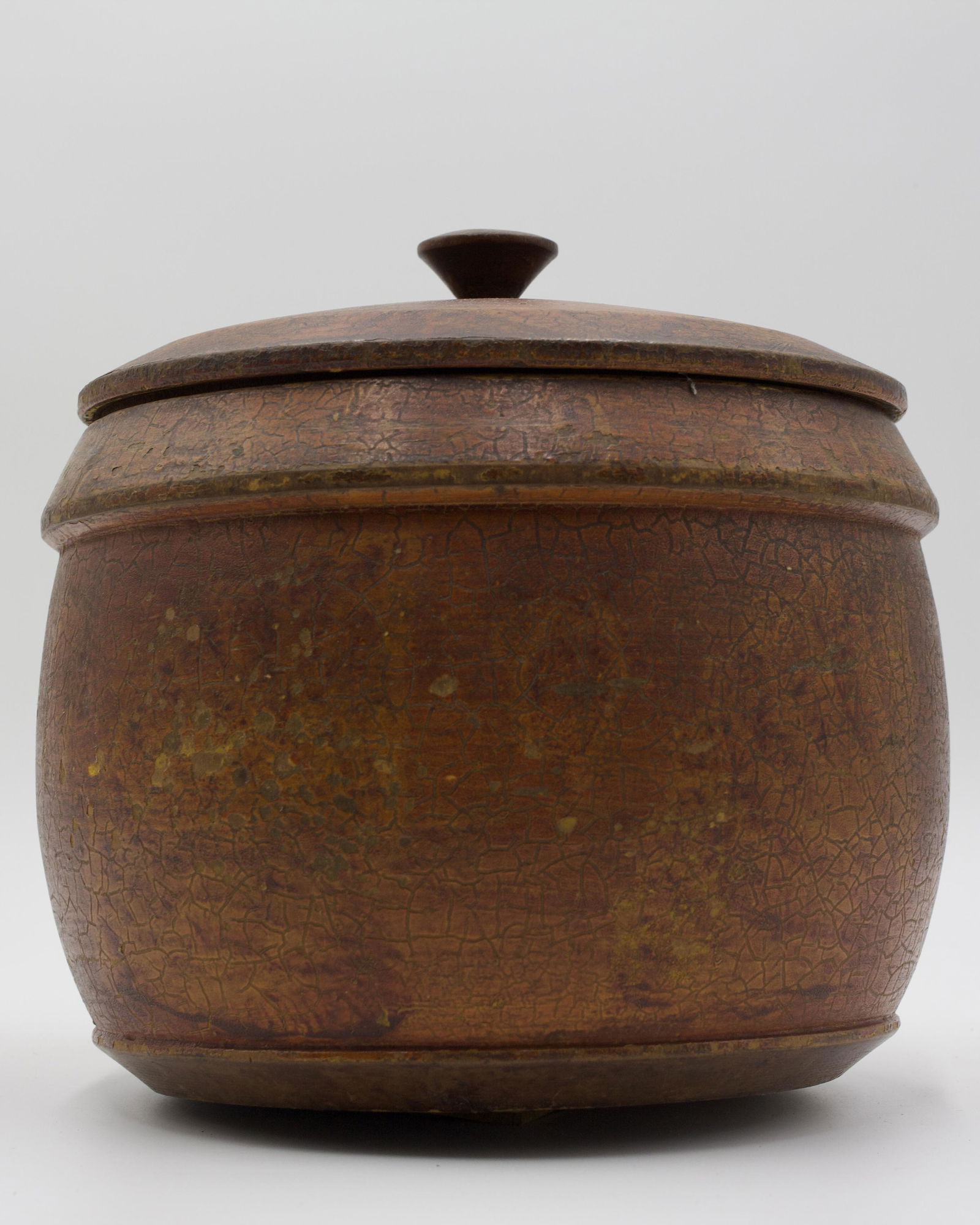PAINT DECORATED TREENWARE STORAGE CONTAINER (SUGAR) WITH FITTED COVER.
