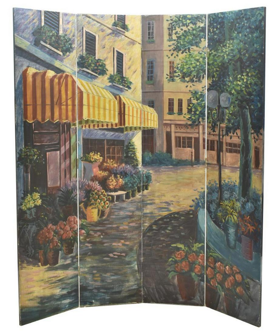 PAINTED CANVAS ON WOOD FOUR-PANEL FOLDING SCREEN