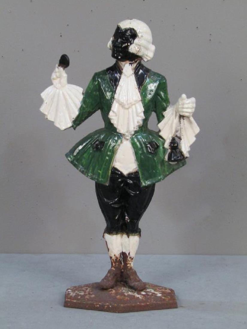 SoldAntique Black Americana Butler Cast Iron Figural DoorstopA painted cast iron figural doorstop depicting a butler dressed in 18th century attire. Retains traces of the original hand-painted polychrome finish in red, gold, and green. Flat-backed form with semSee Sold Price