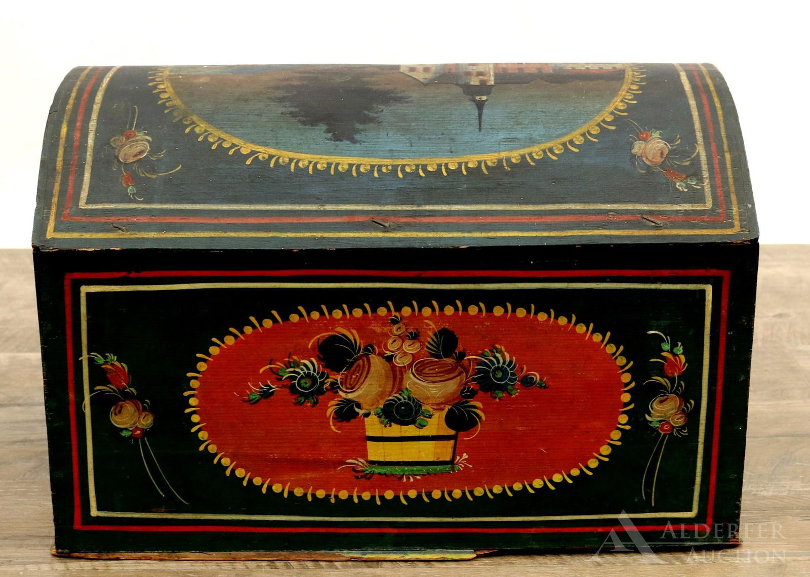 SoldPainted Decorated Dome Lid Document ChestDome lid chest with painted landscape vignette on lid, sides decorated with potted floral motif and interior with narrow till. Bottom marked (ill). 12.5"h x 18.5"w x 12"d **Please Note: This item is NSee Sold Price