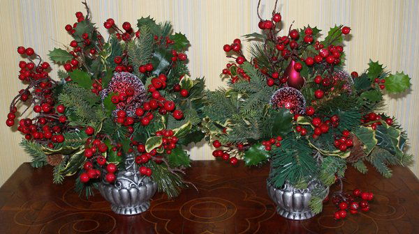 PAINTED SILVER CACHE POTS W/CHRISTMAS HOLLY