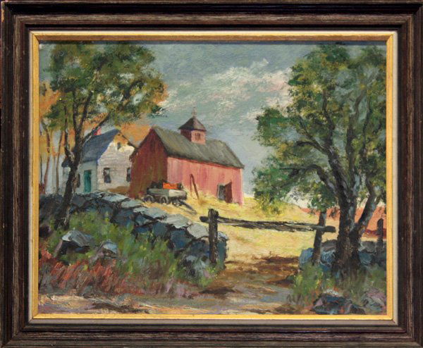 JAMES PENNEY Modernist Abstract Painting. "Farm Buildings Winter". Signed, 1952. Painted on Canvas oJAMES PENNEY Modernist Abstract Painting. "Farm Buildings Winter". Signed, 1952. Painted on Canvas on Masonite. KRAUSHAAR GALLERIES, NYC Exhibition Gallery Label. Dimensions: Height: 32.25 inches, Wid
