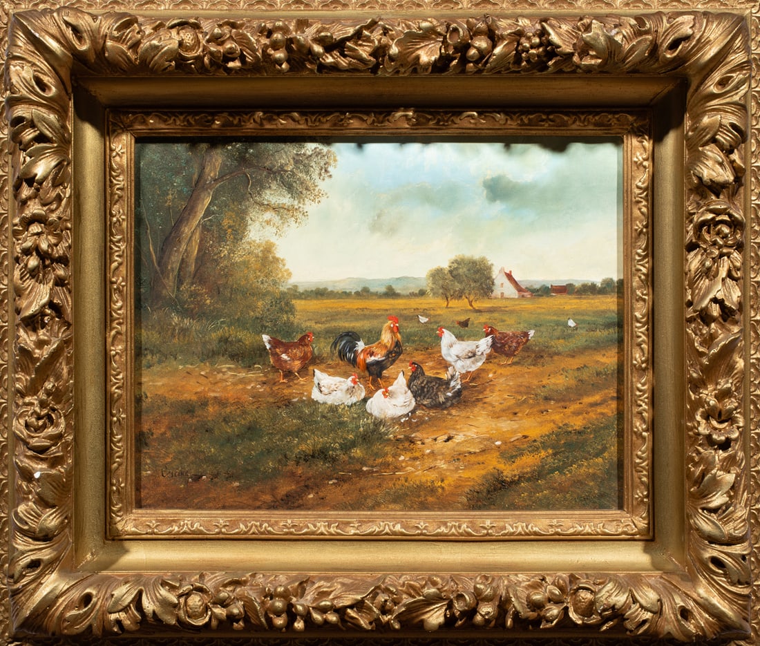 French oil on canvas painting with chickens