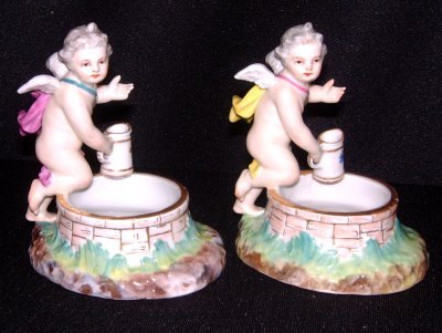 SoldPair 19th Cent. Old Berlin Porcelain Salt CellarsShell design. Handpainted birds. Dolphin base. Approx. 2 1/2" x 3 1/2" x 2 1/2". From the estate of Arthur Adlman, New York, NY and Cascais, Portugal. (5229)See Sold Price