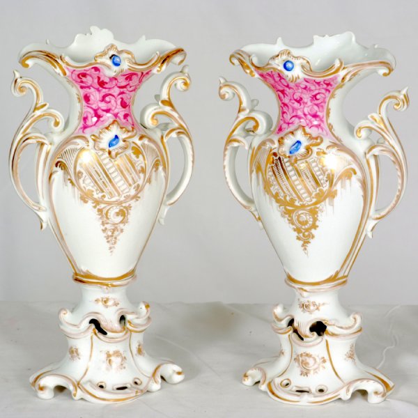 SoldPair Old Paris porcelain vase lampsPair Old Paris porcelain vase lamps, 19th c., hand-painted porcelain garniture vases, no visible marks, 20.25"h x 4"w (total)See Sold Price