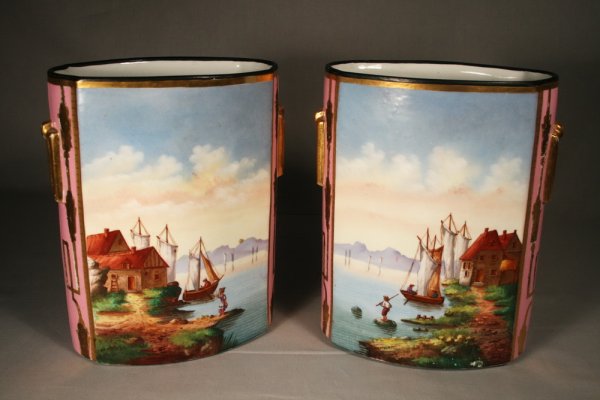 SoldA Pair of English Porcelain Hand-Painted Square Cache PotsA Pair of English Porcelain Hand-Painted Square Cache Pots Attributed to Coalport and Coalbrookdale Porcelain Factory, Circa 1850 apparently unmarked. Height 7 x width 5 1/4 x depth 5 1/4 inches.See Sold Price