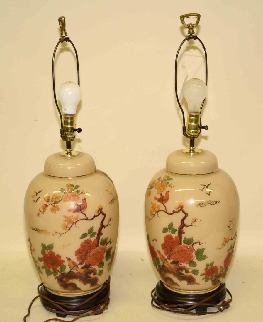 SoldGLO-MAR ARTWORKS HAND-PAINTED LAMPS LOT OF 2GLO-MAR ARTWORKS HAND-PAINTED LAMPS LOT OF 2 Pair of hand-painted table lamps from Glo-Mar Artworks, Inc. (New York). Matching pink and blue floral design on cream-colored background, each signeSee Sold Price