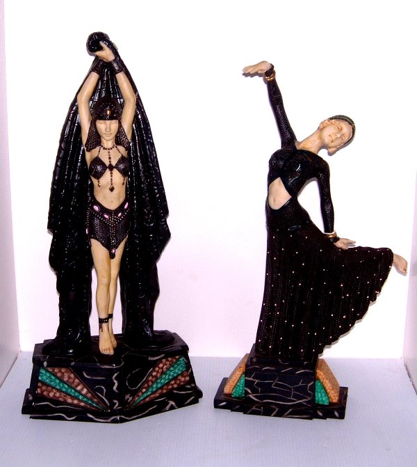 Sold(2) Art Deco style figural candlesticks, 15"hPair of similar early to mid 20th century spelter figural candlesticks in the form of maidens in Egyptian dress, raised on round pedestals, 15"h x 4.75" diameter base.See Sold Price