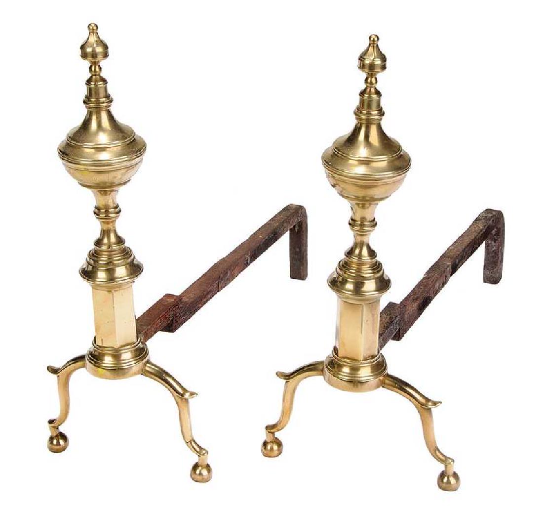 Pair American Brass Steeple Top Andirons