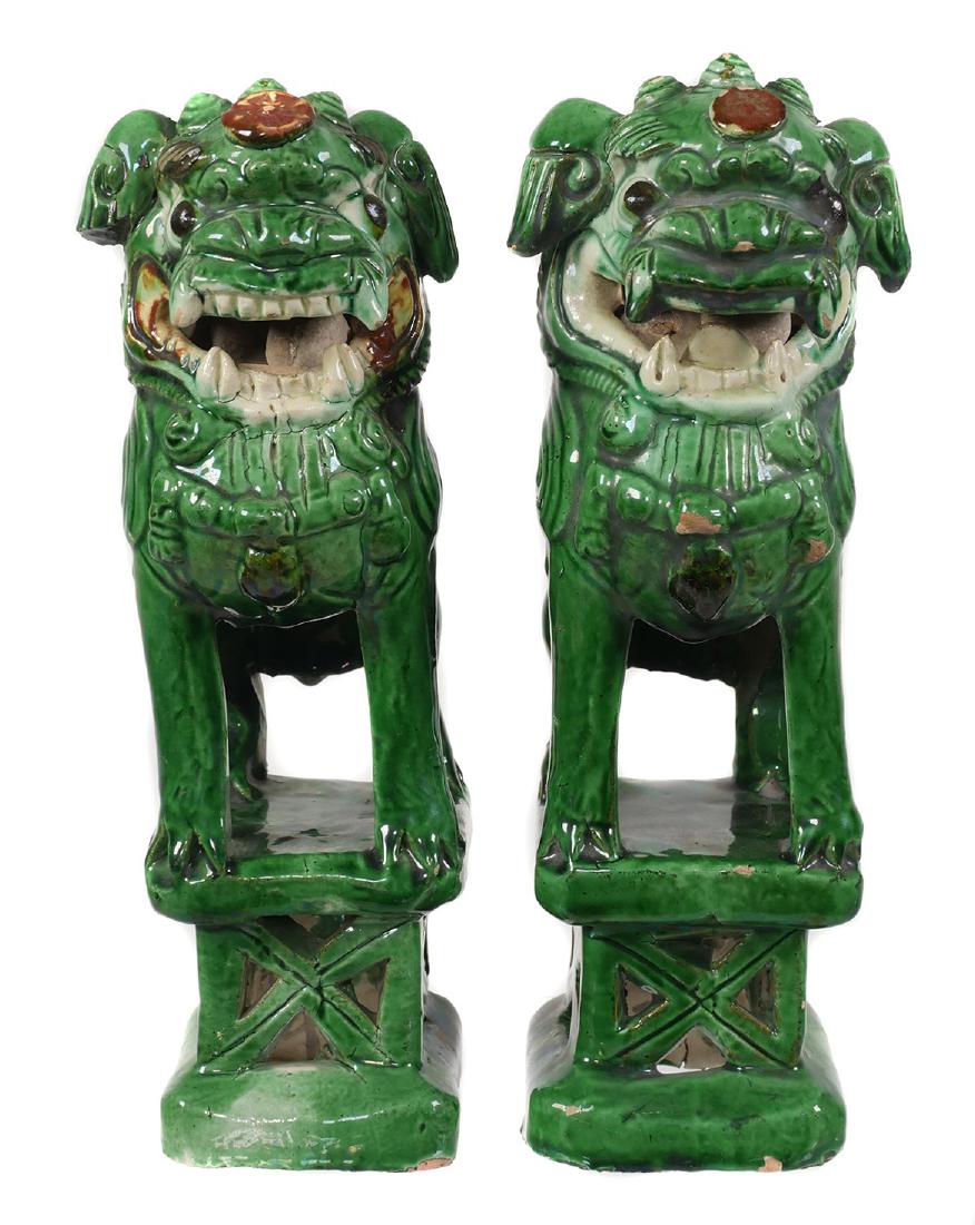 Pair Antique Green Glazed Foo Dogs