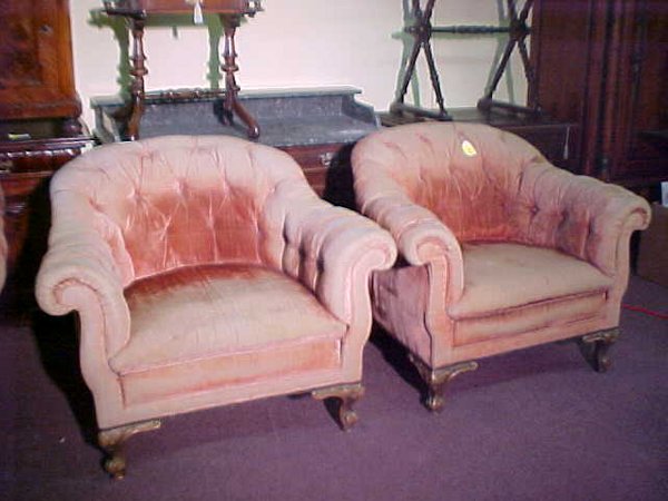 PAIR ANTIQUE OVERSTUFFED TUFTED ARM CHAI