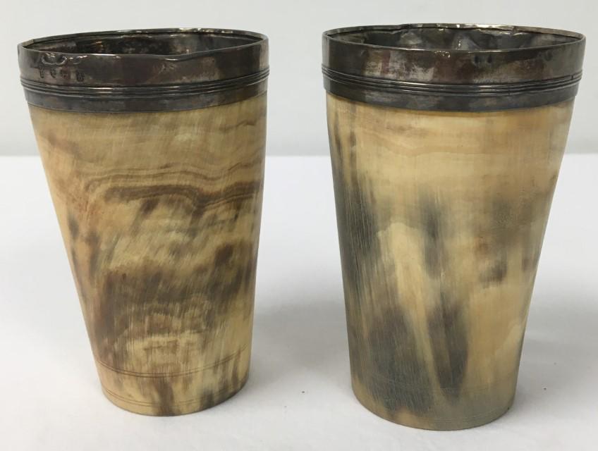 PAIR ANTIQUE SHEFFIELD SILVER LINED HORN CUPS