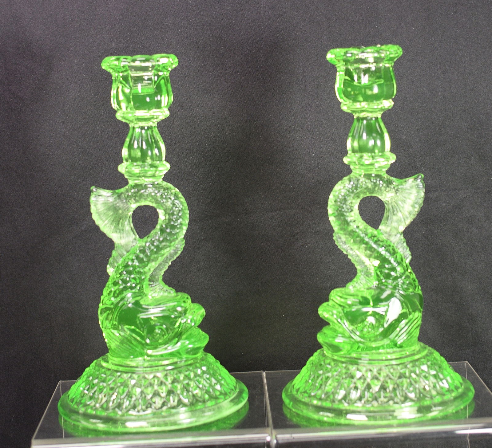 PAIR CAMBRIDGE URANIUM GLASS CANDLESTICKS